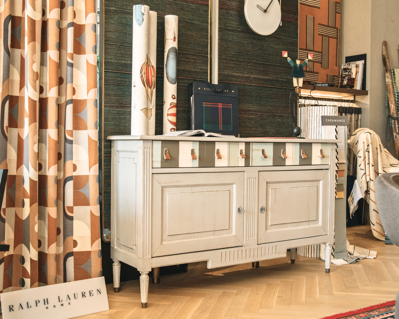 Caratteristiche: madia in stile francese, struttura e piano in legno, cassetto con pattern a righe multicolore e dettagli in pelle.